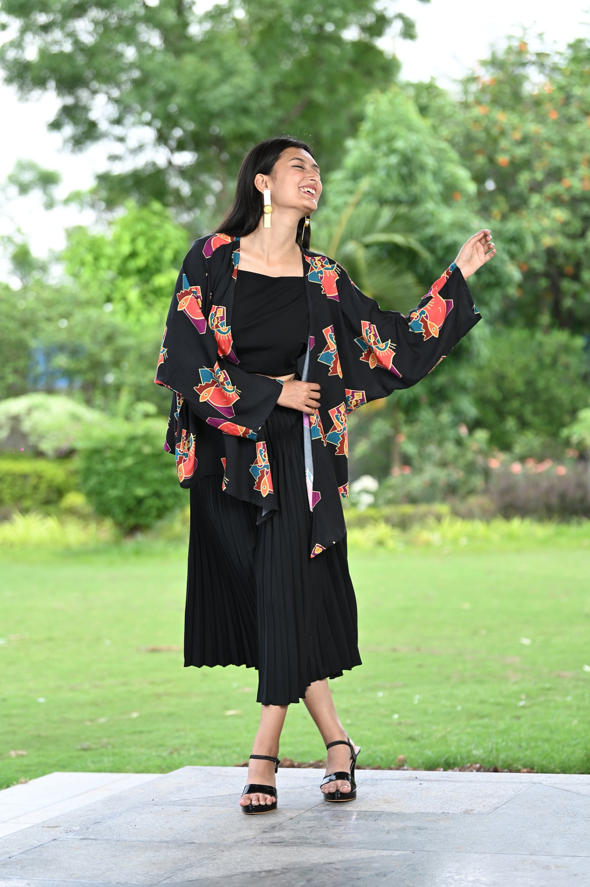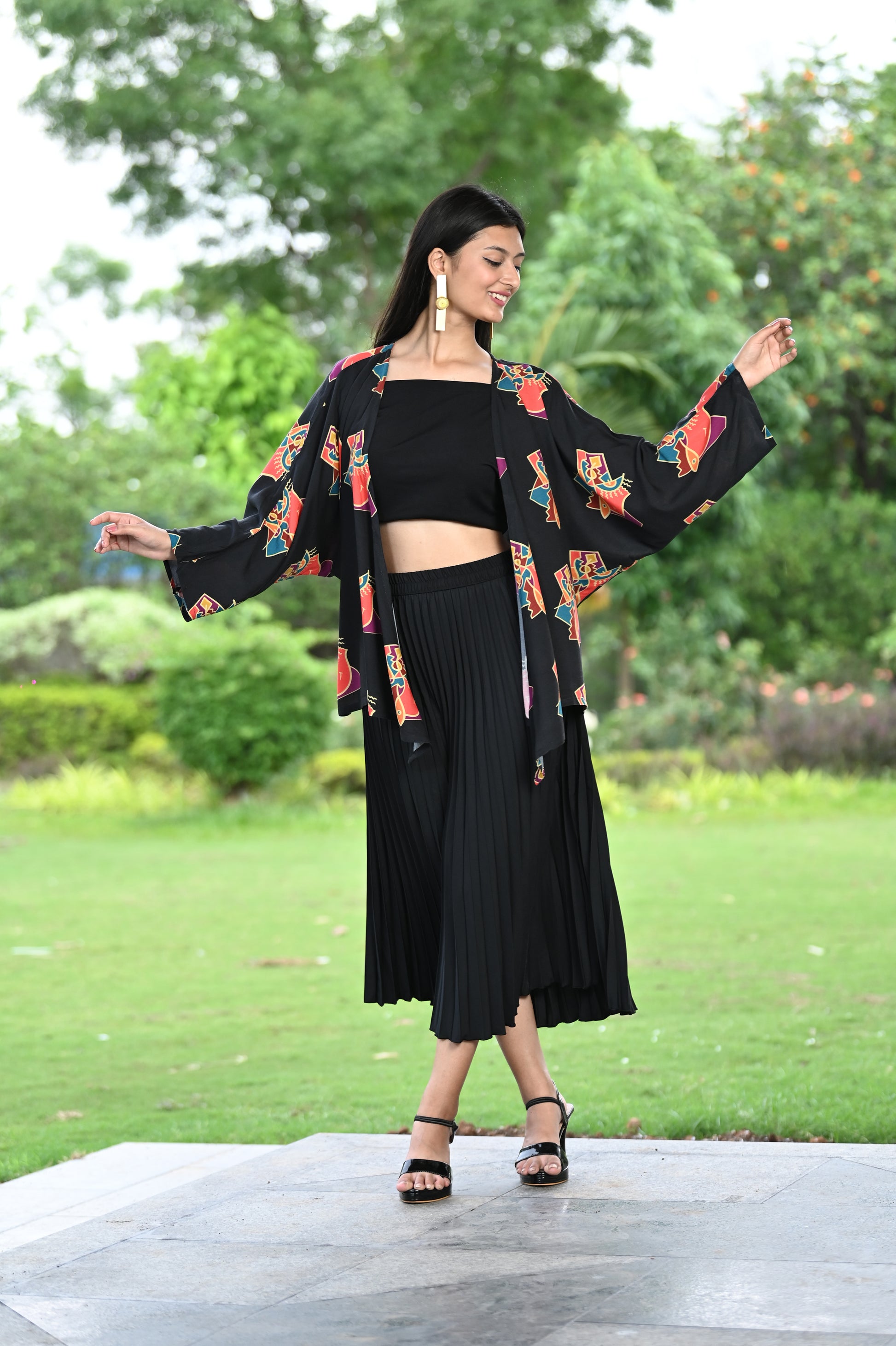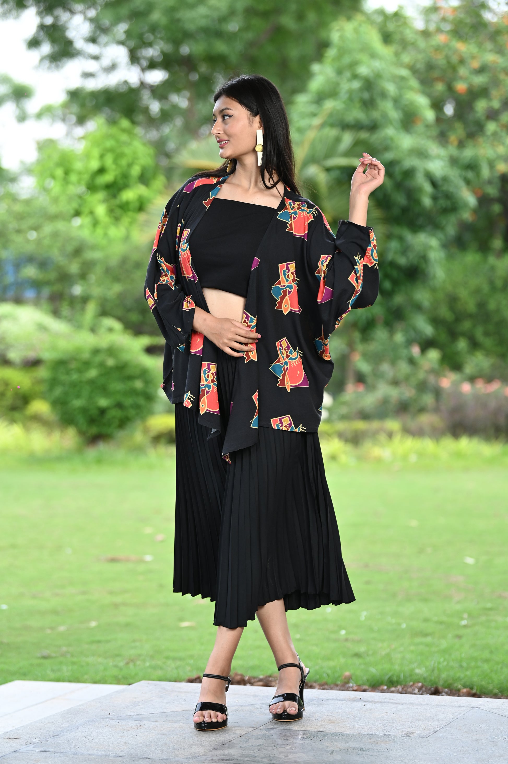 Here is our version of abstract art in our signature zenscrawl style, hand-drawn and printed on rayon fabric. The shrug is versatile and opens options to style it the way you like.
