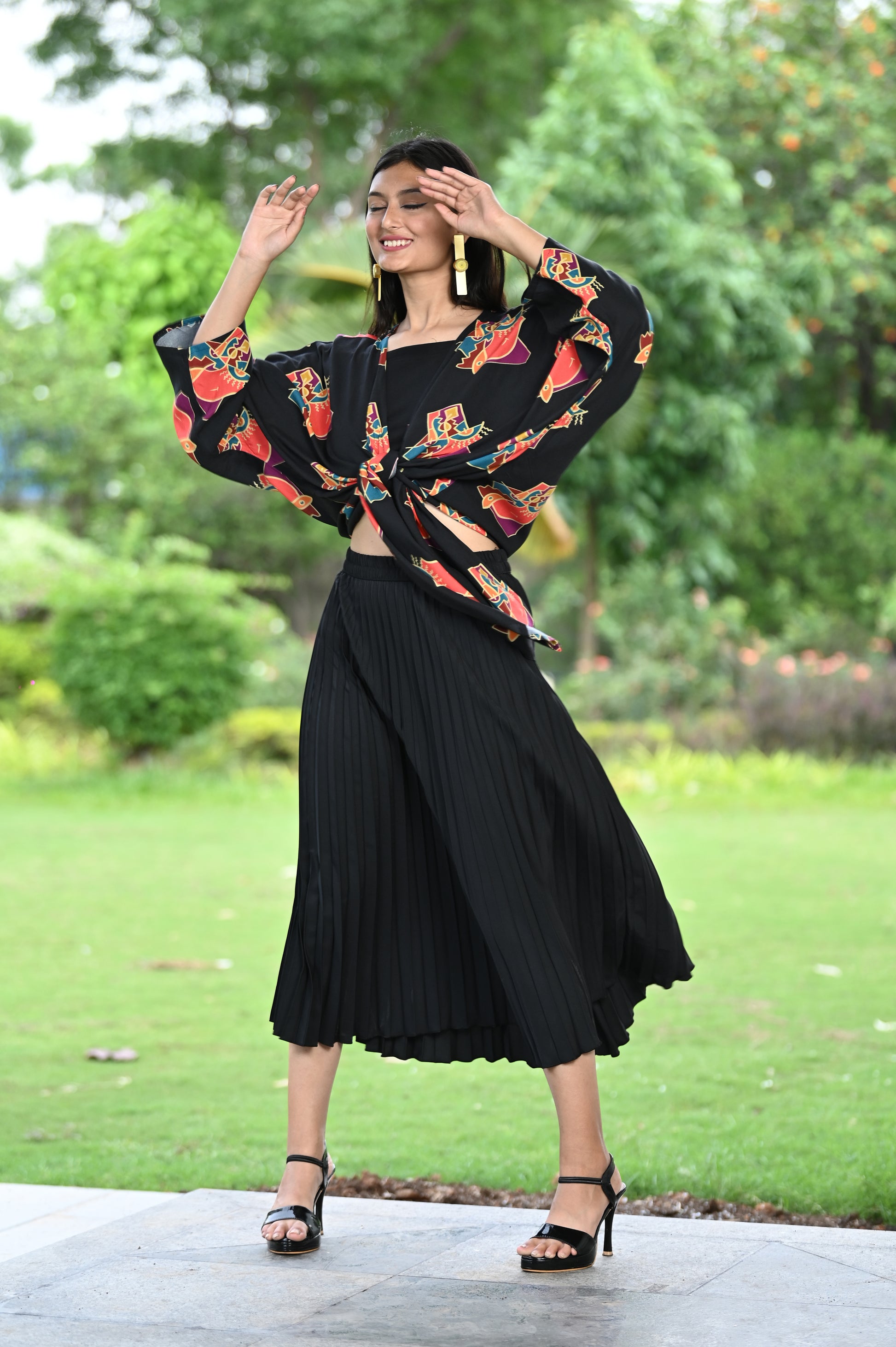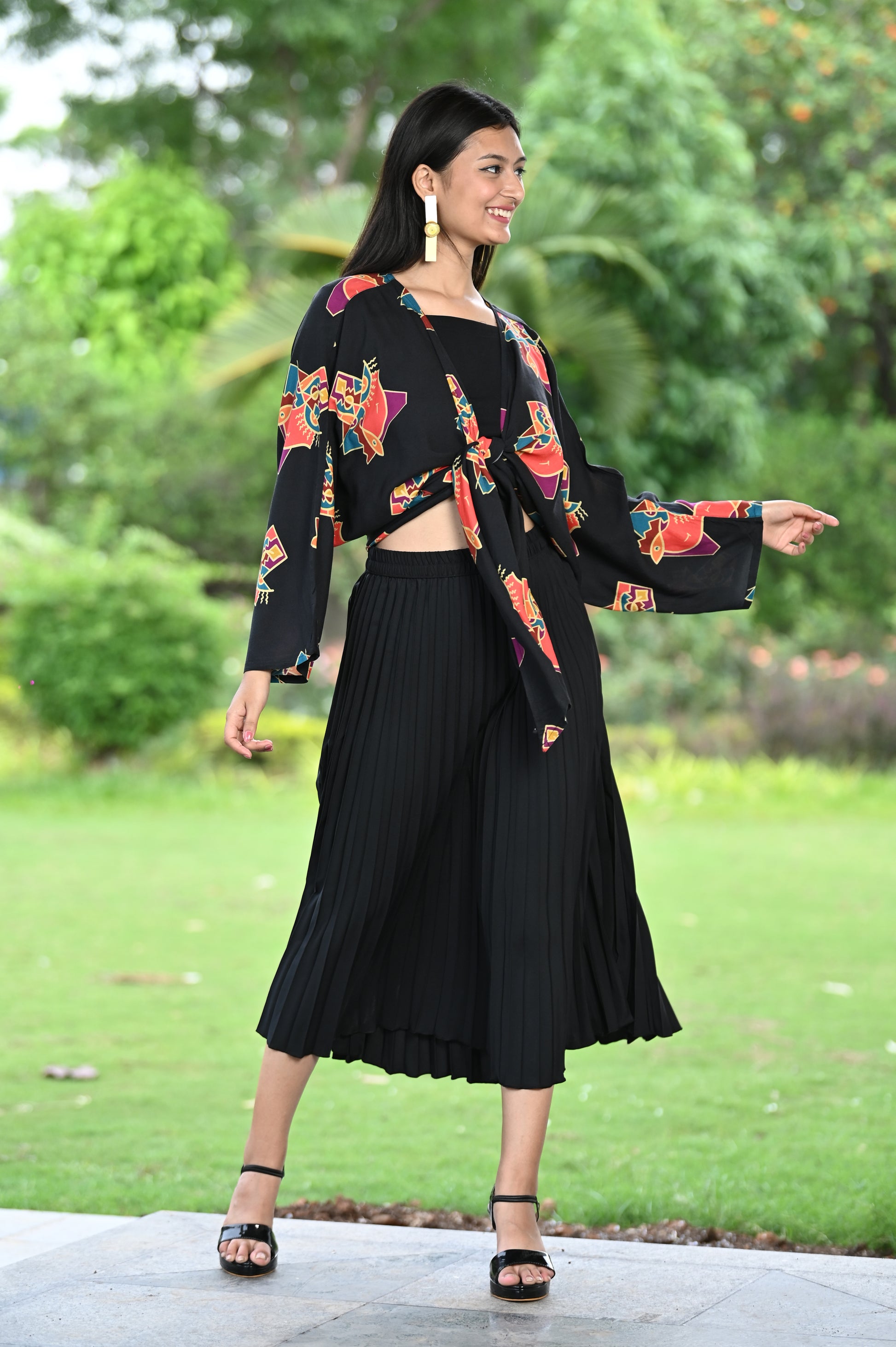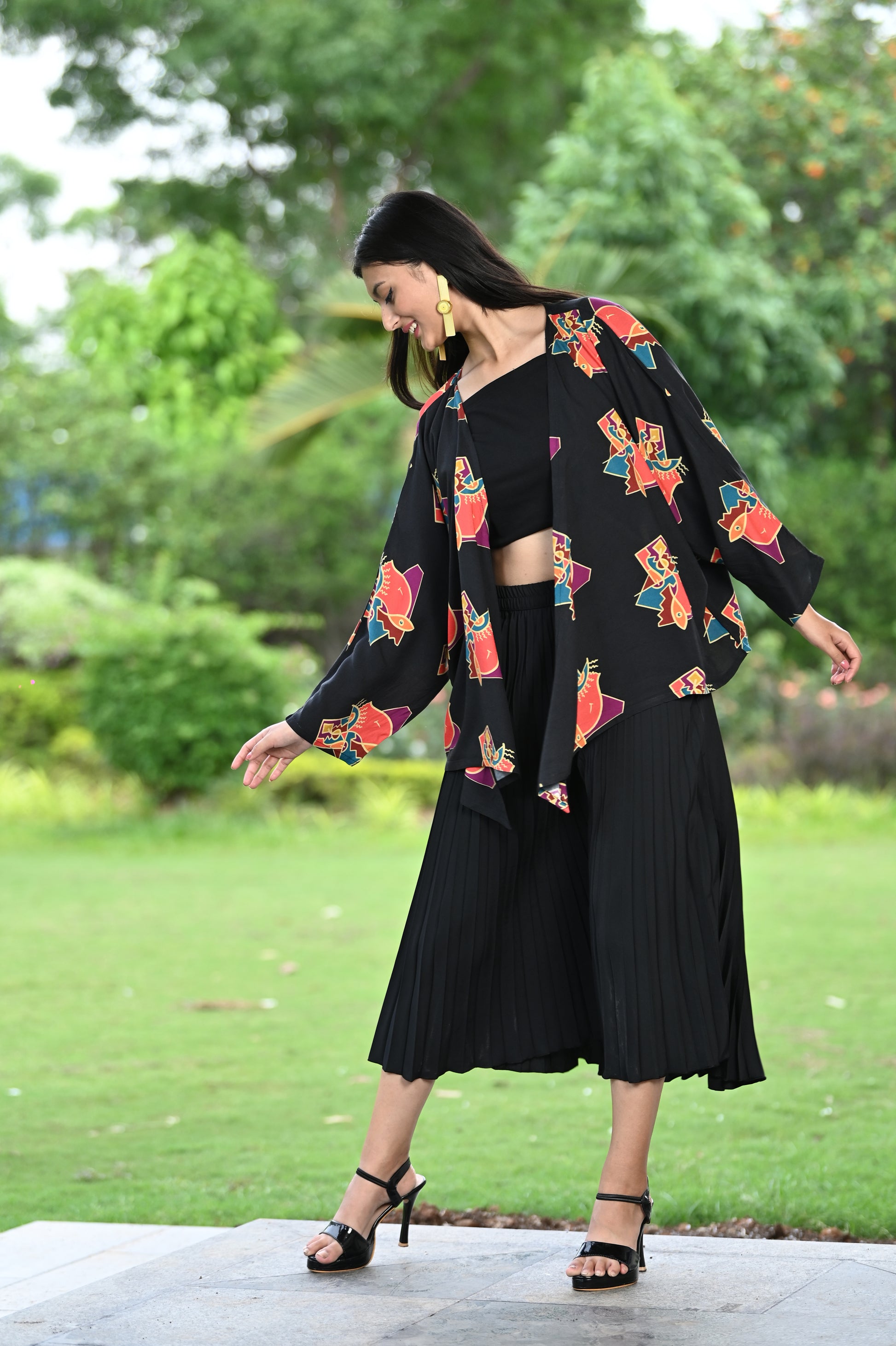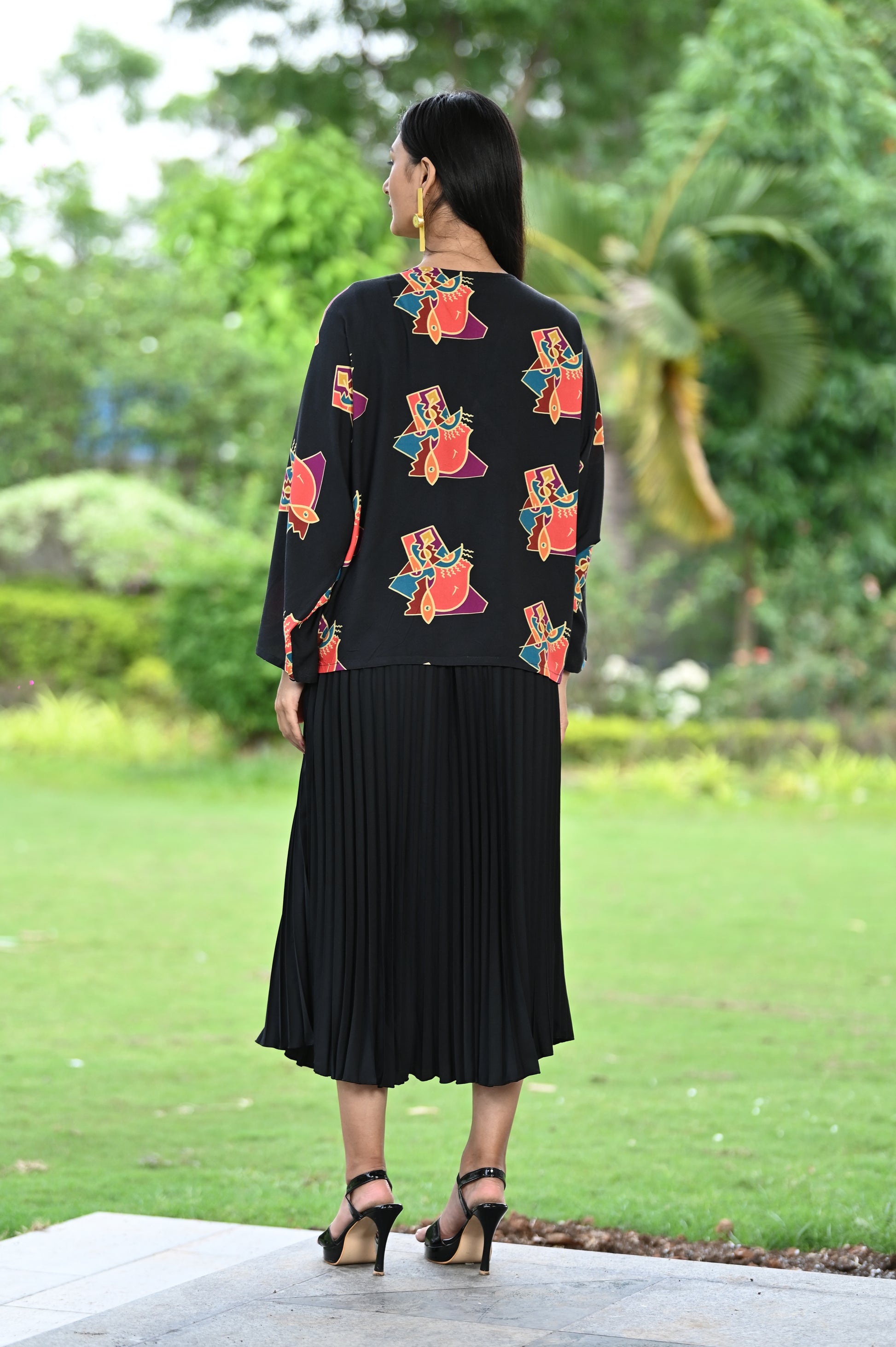 Here is our version of abstract art in our signature zenscrawl style, hand-drawn and printed on rayon fabric. The shrug is versatile and opens options to style it the way you like.