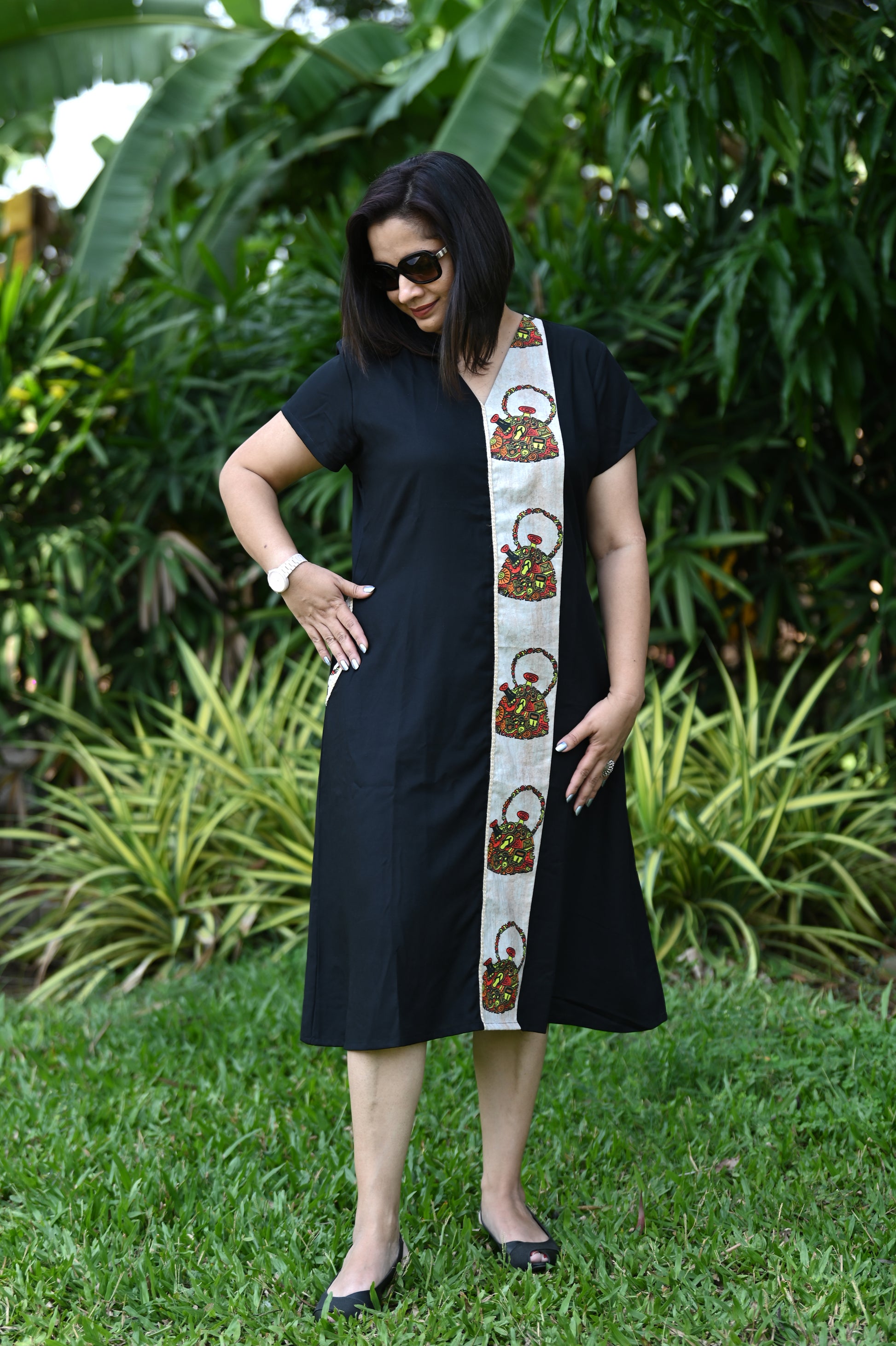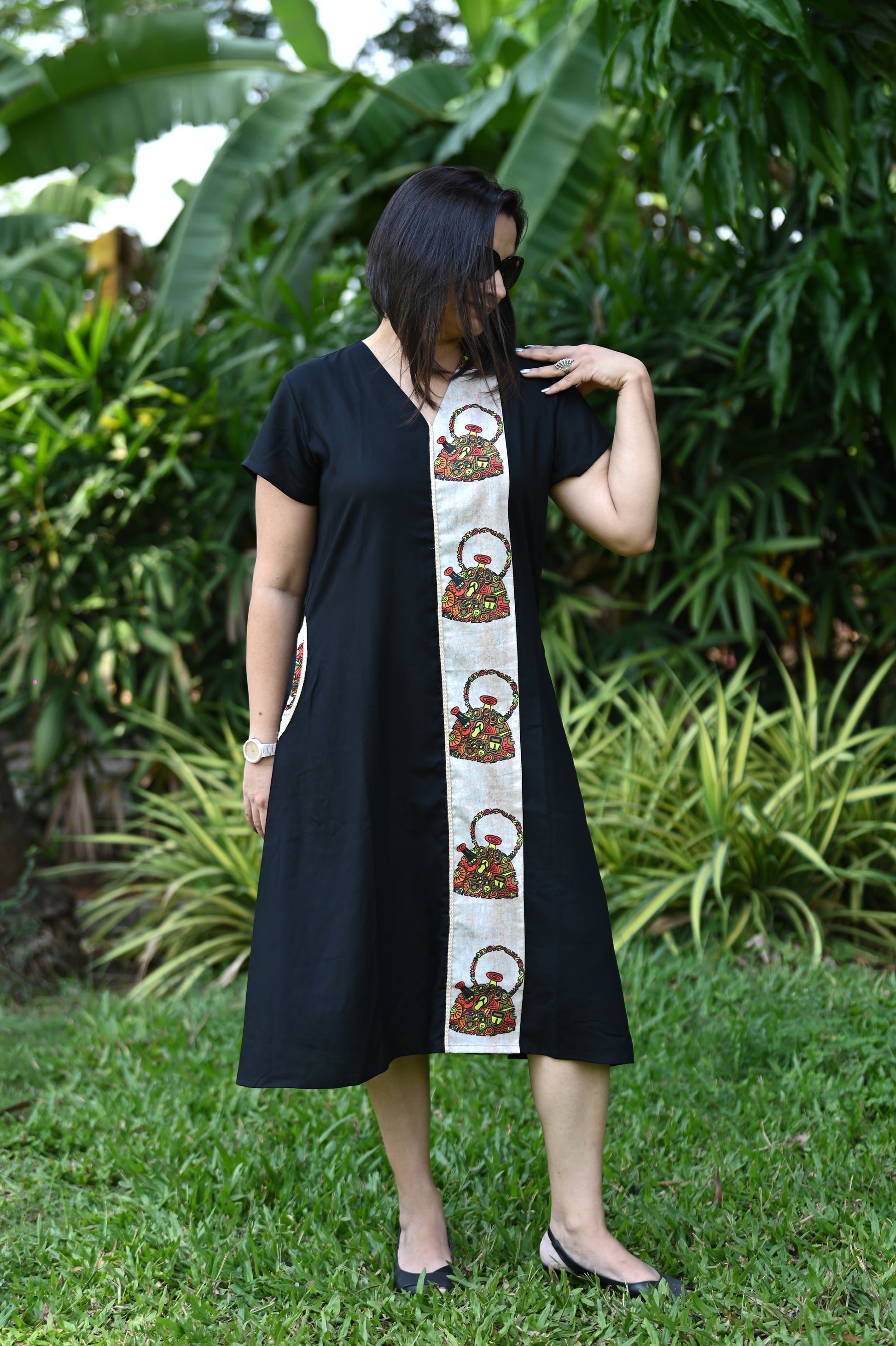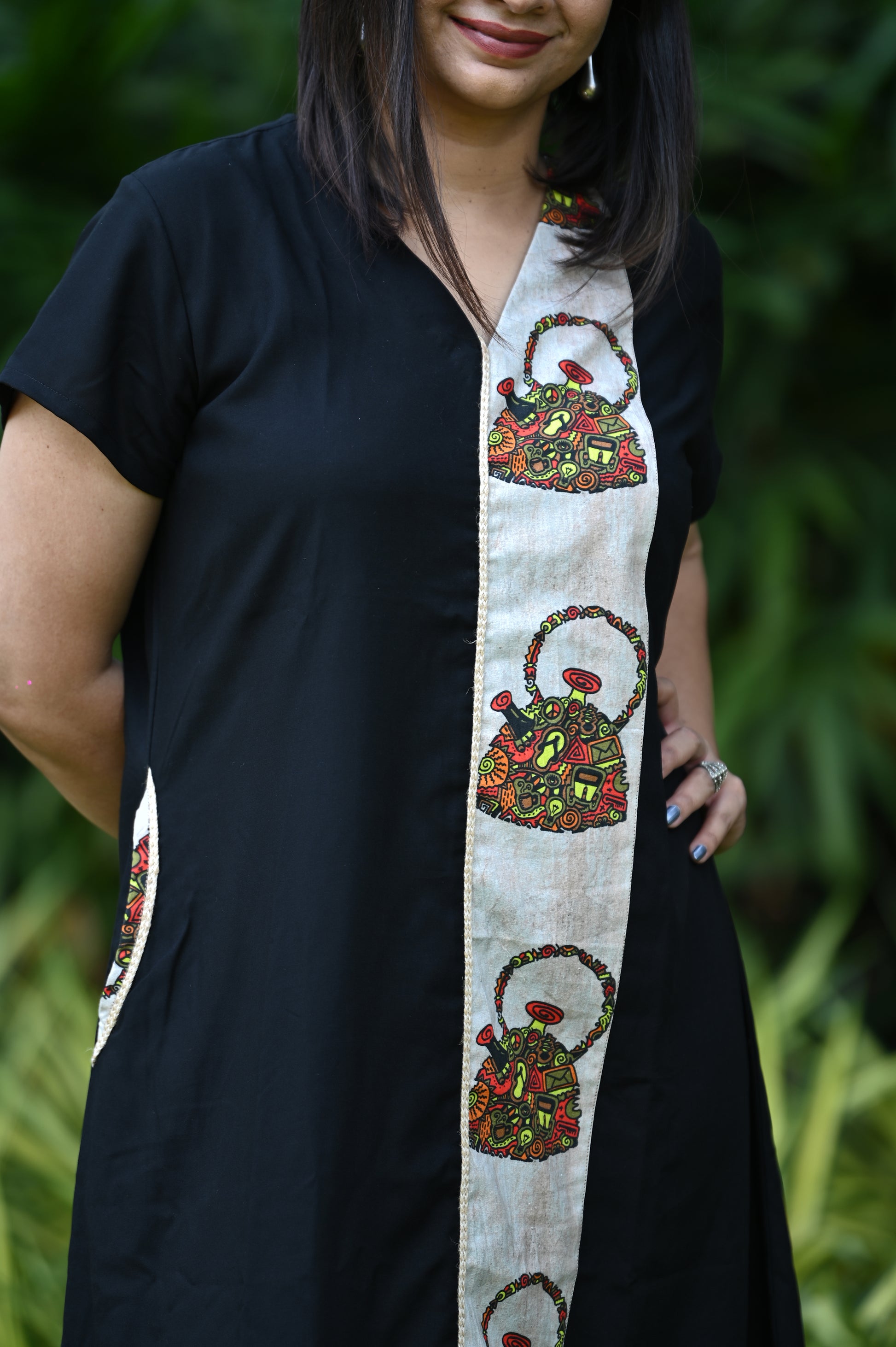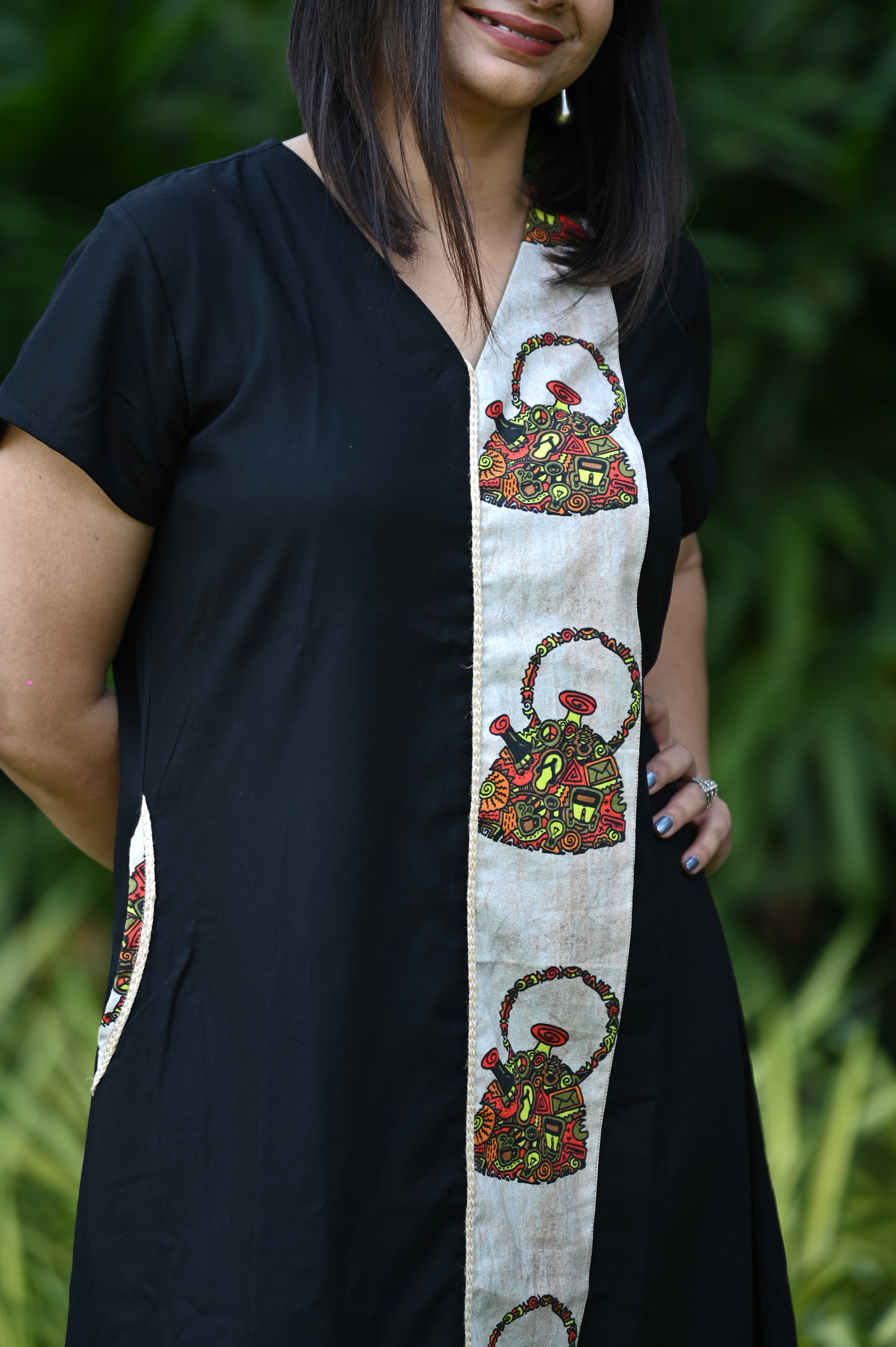 A hand-drawn chai kettle motif, printed on cotton, combined with rayon and made into a chic dress.