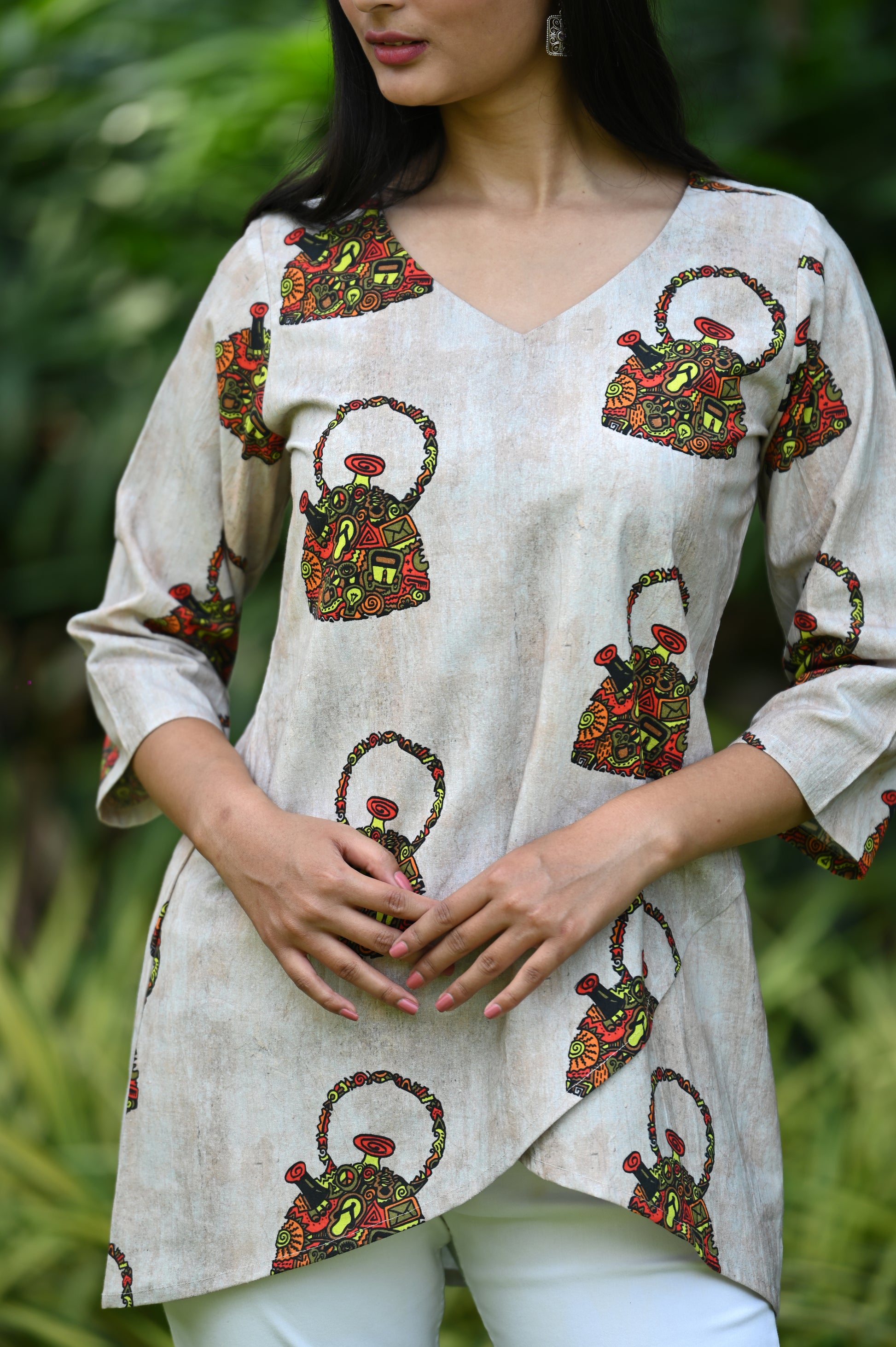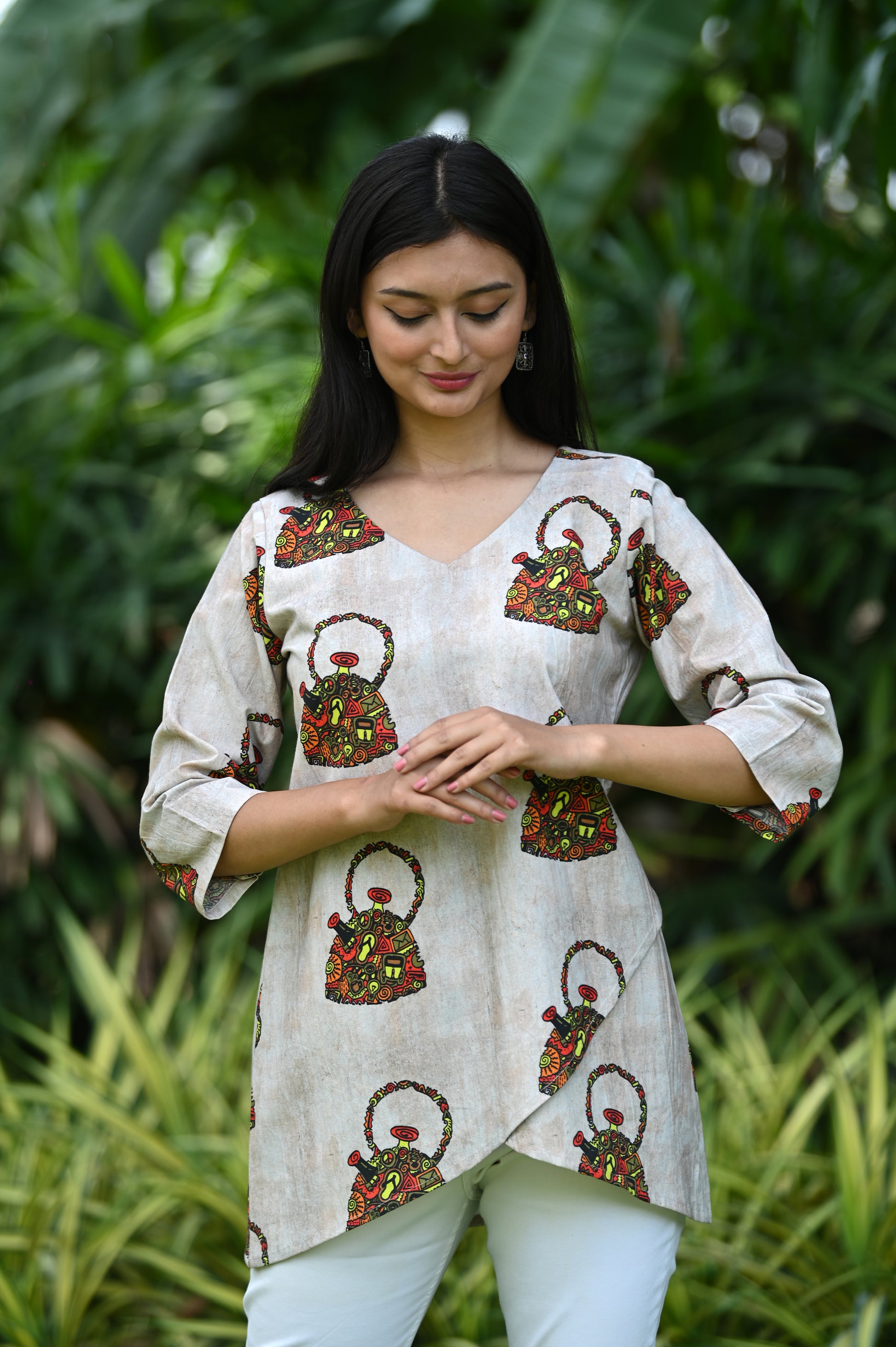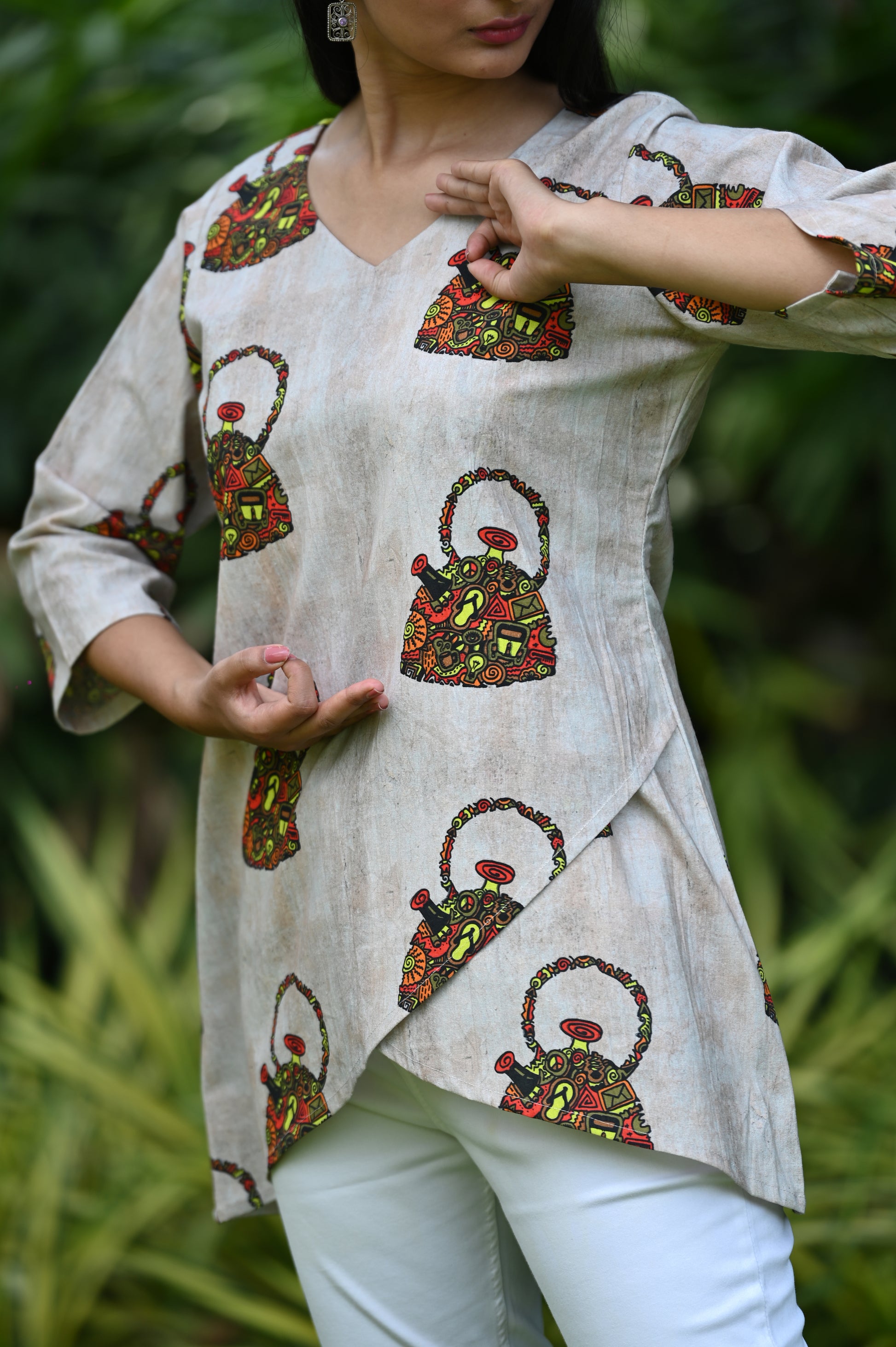 A hand-drawn chai kettle motif, printed on cotton and made into a chic overlap short tunic.