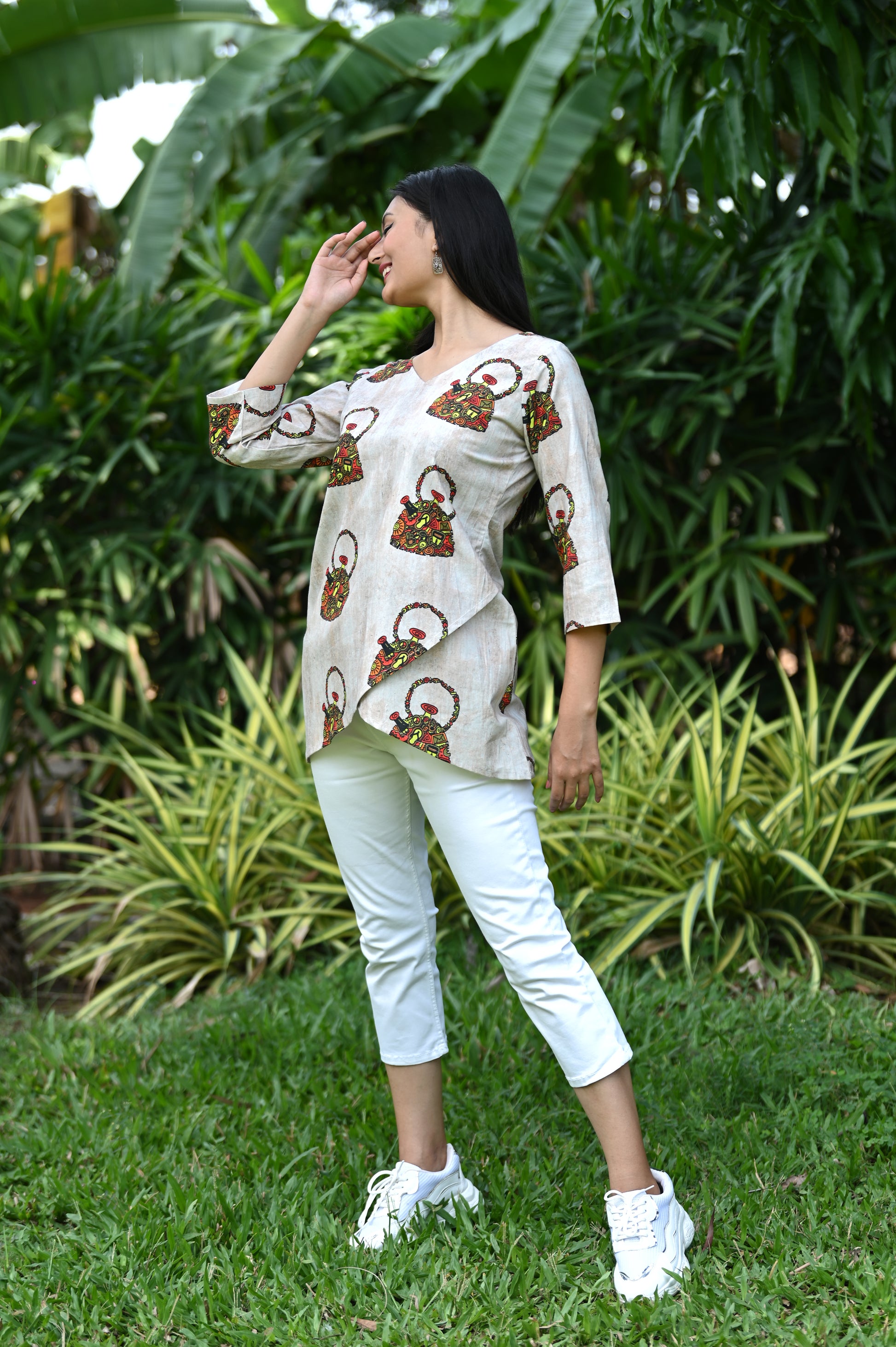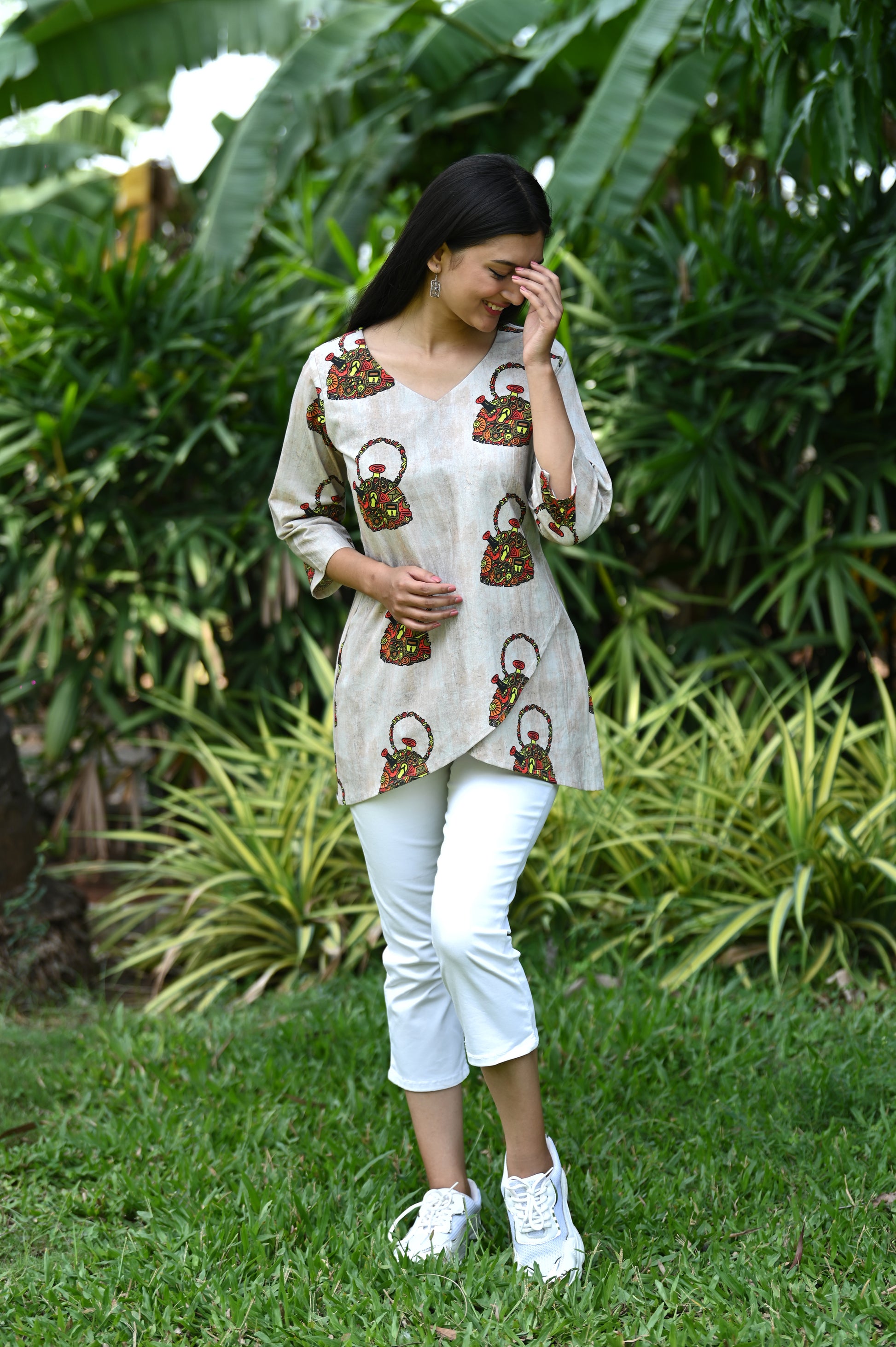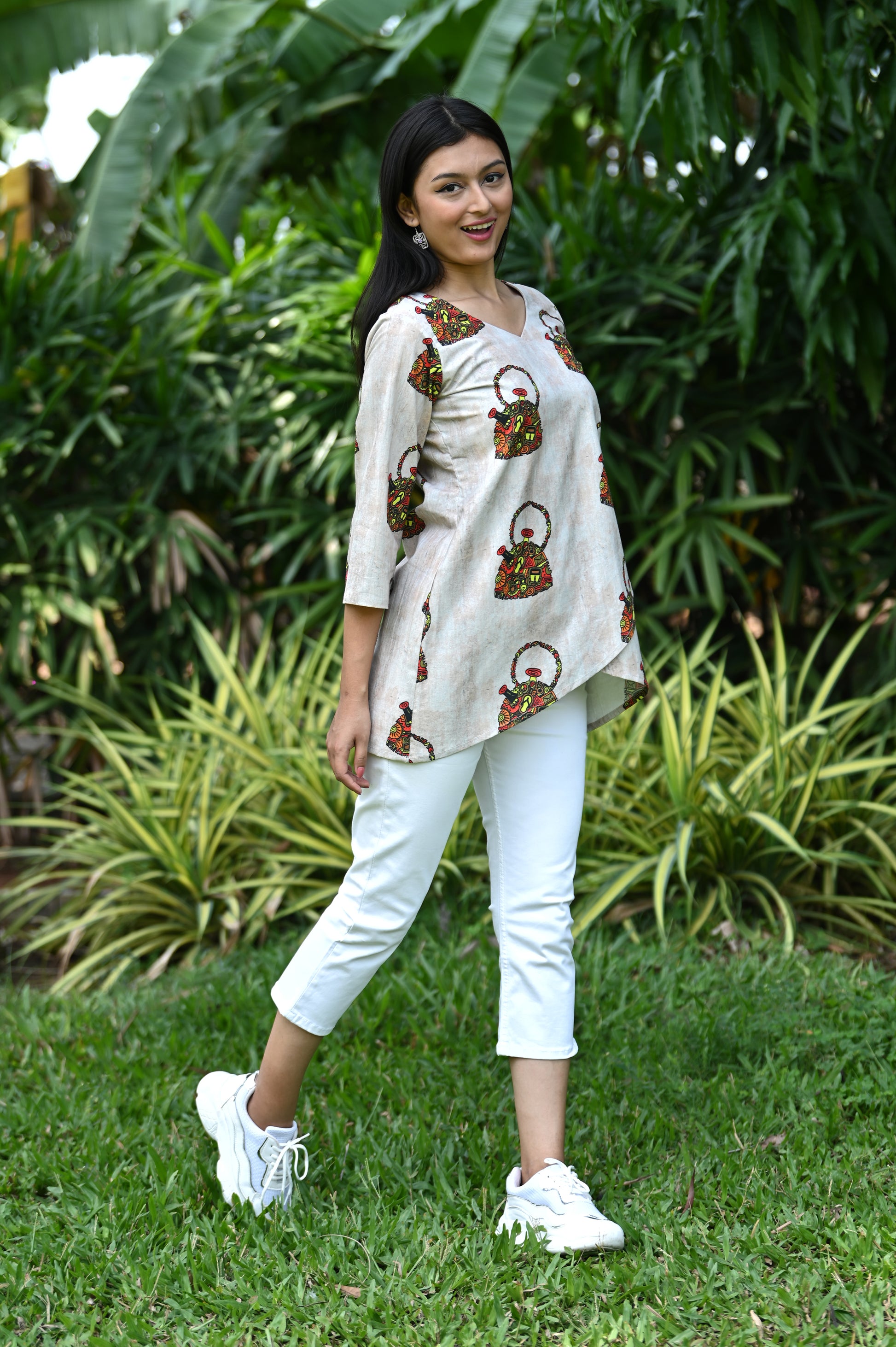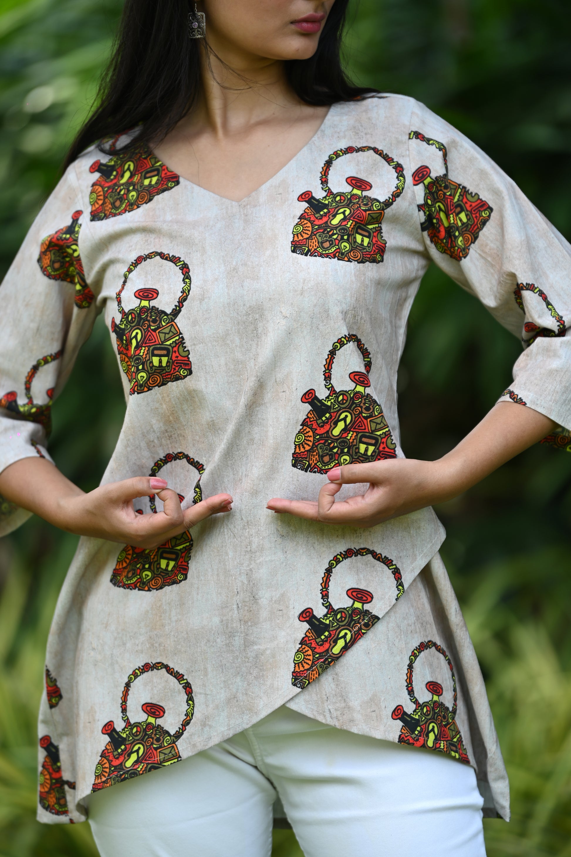 A hand-drawn chai kettle motif, printed on cotton and made into a chic overlap short tunic.
