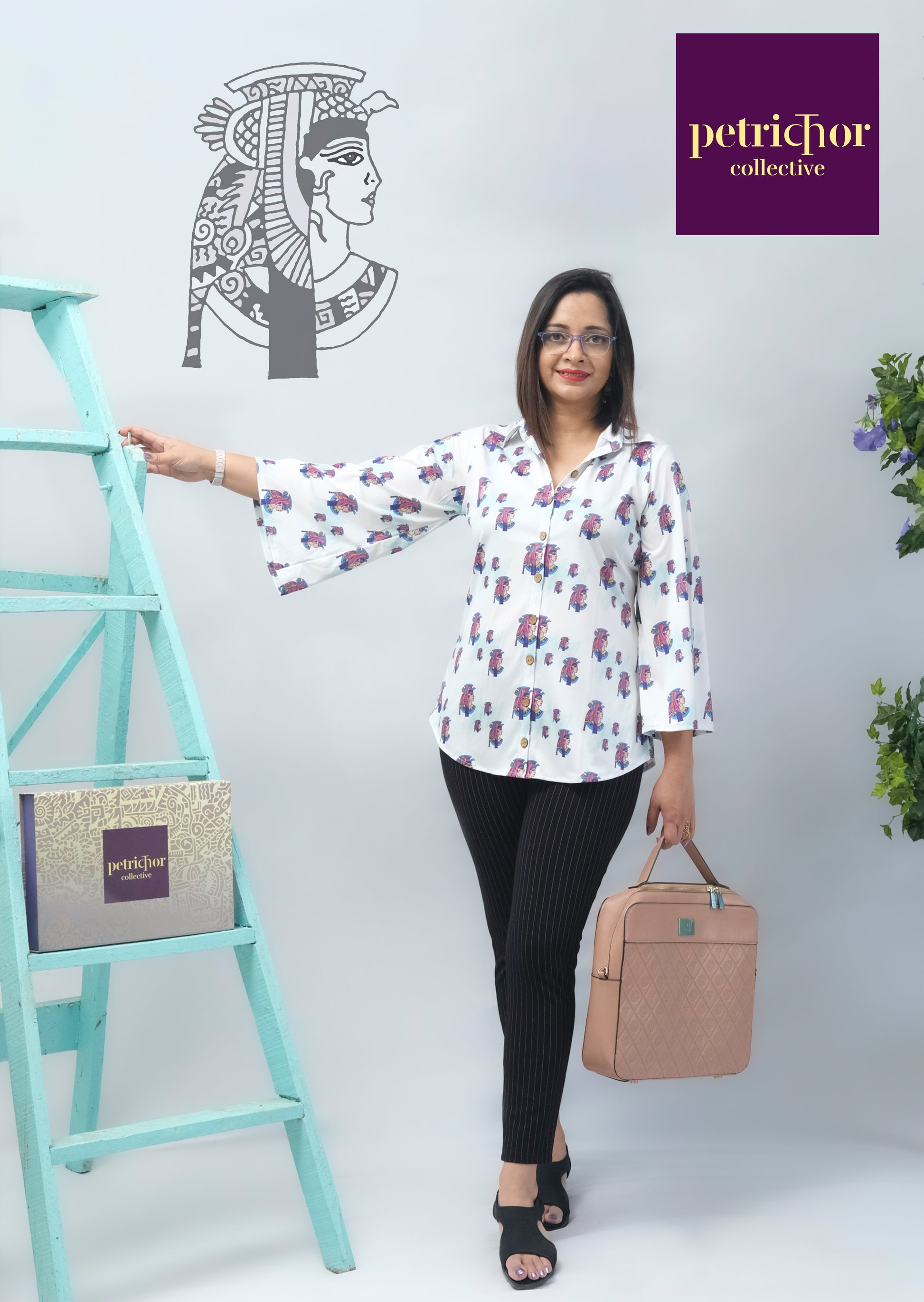Quirky, colorful Cleopatra hand-drawn and converted into a trendy bell-sleeved vintage shirt.
