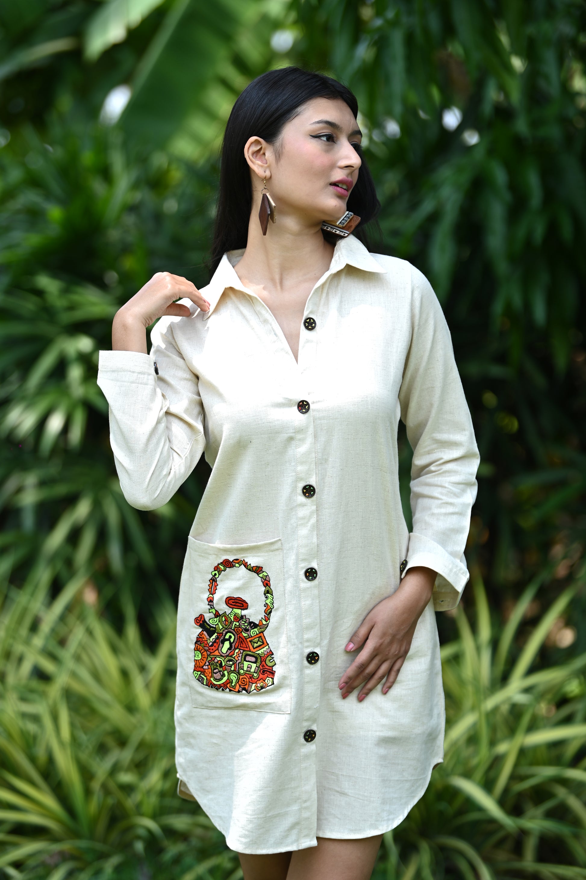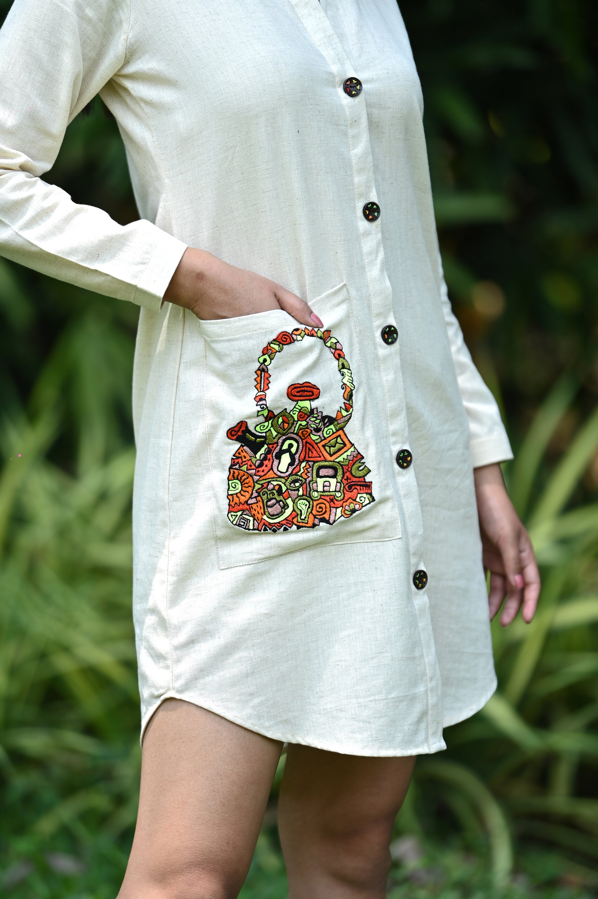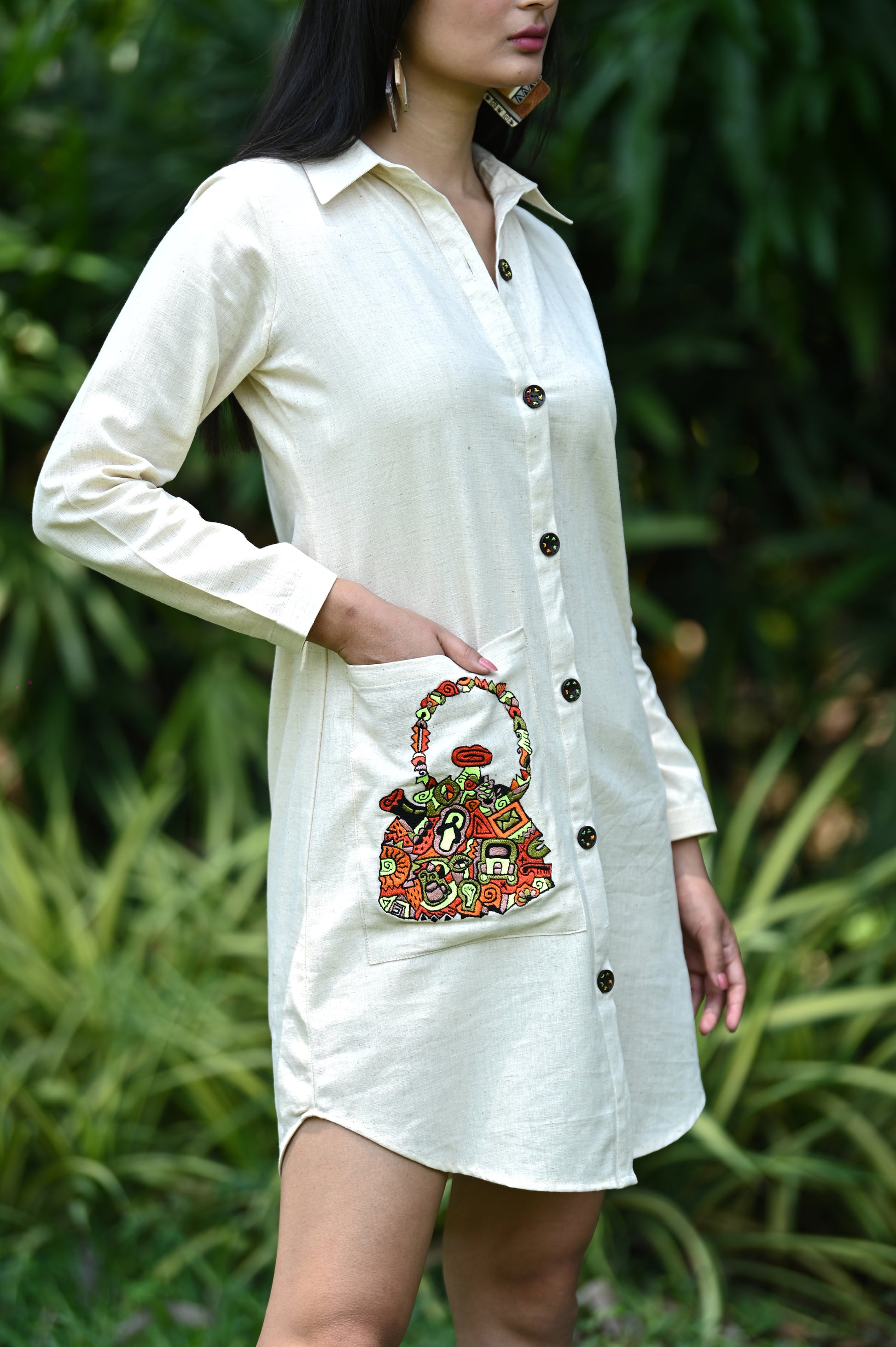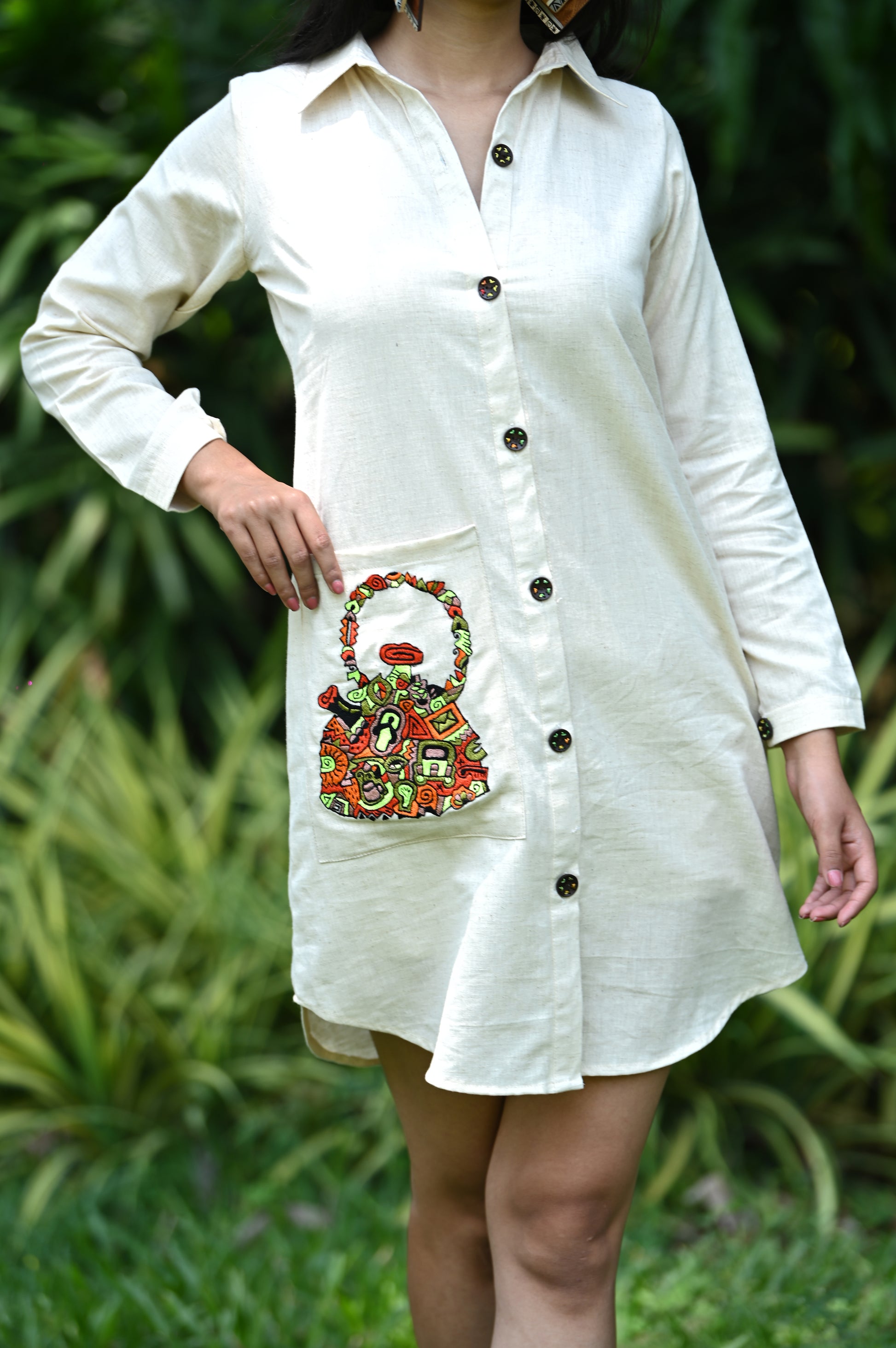 A hand-drawn chai kettle motif, embroidered on cotton, and made into a chic pocket short dress.