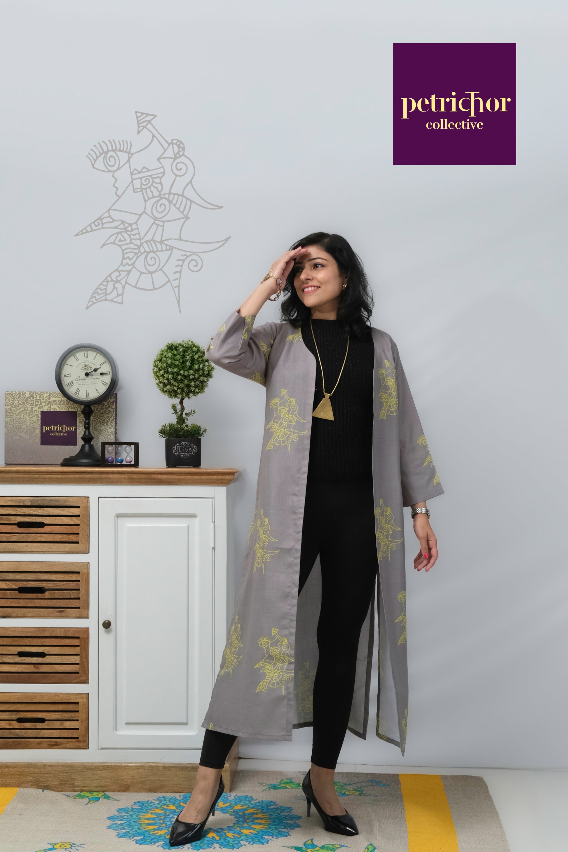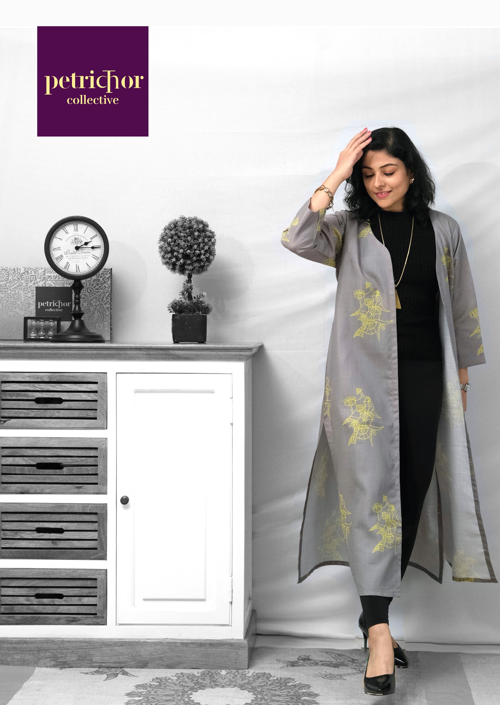 An abstract yellow zenscrawl against a grey background, printed on cotton cambric. The jacket is long which makes it versatile enough to wear with Indian and western couture.
