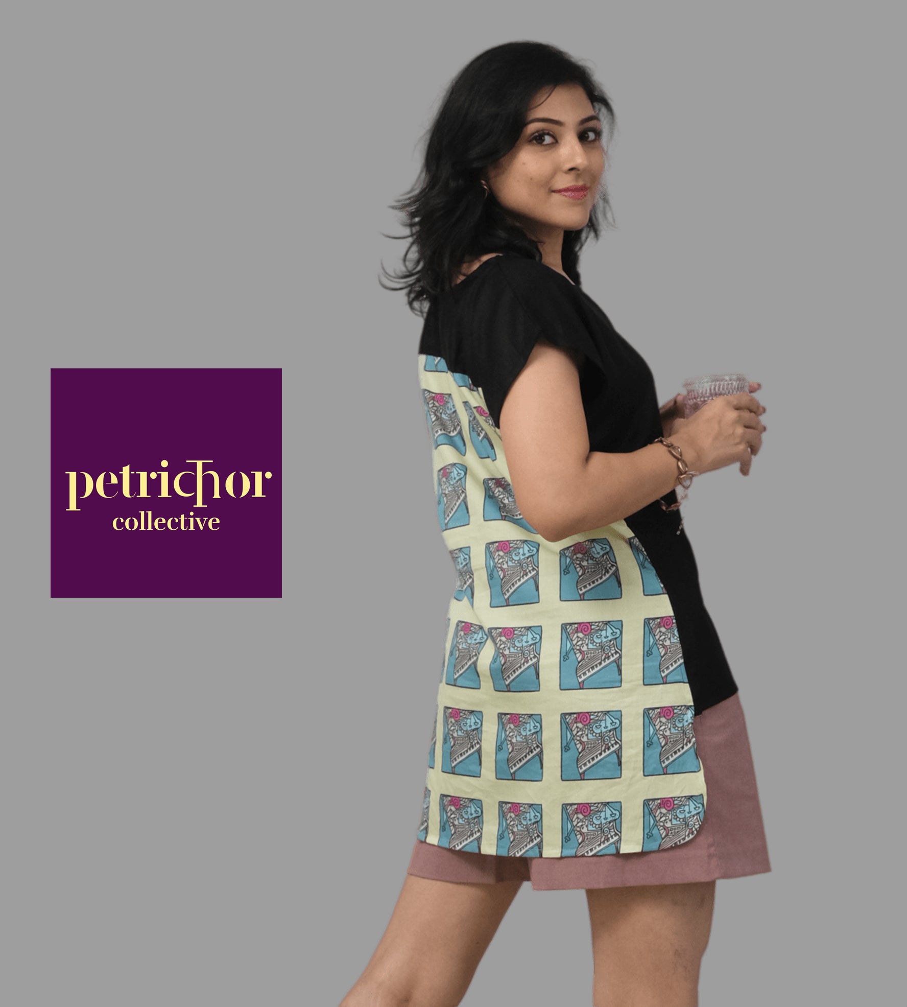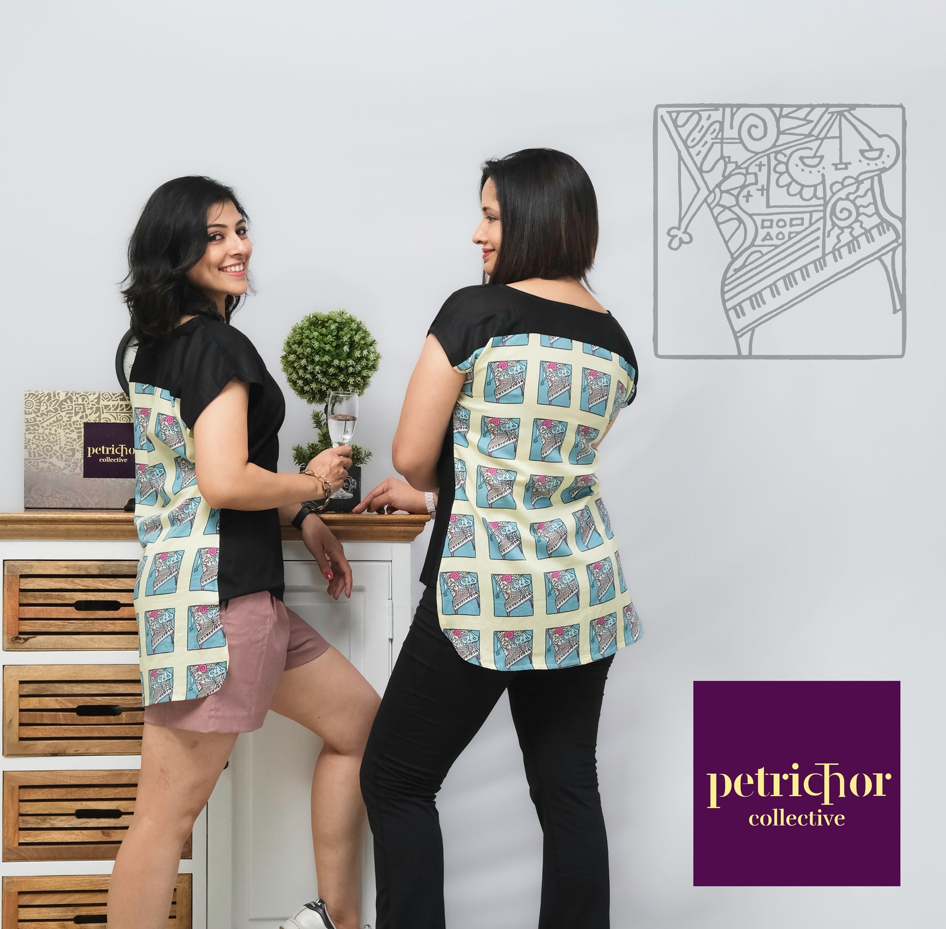 Who doesn't love music? So we drew an abstract piano, printed it on cotton silk and combined it with black rayon to create this trendy, two-level top. The front is plain black and the back is printed.