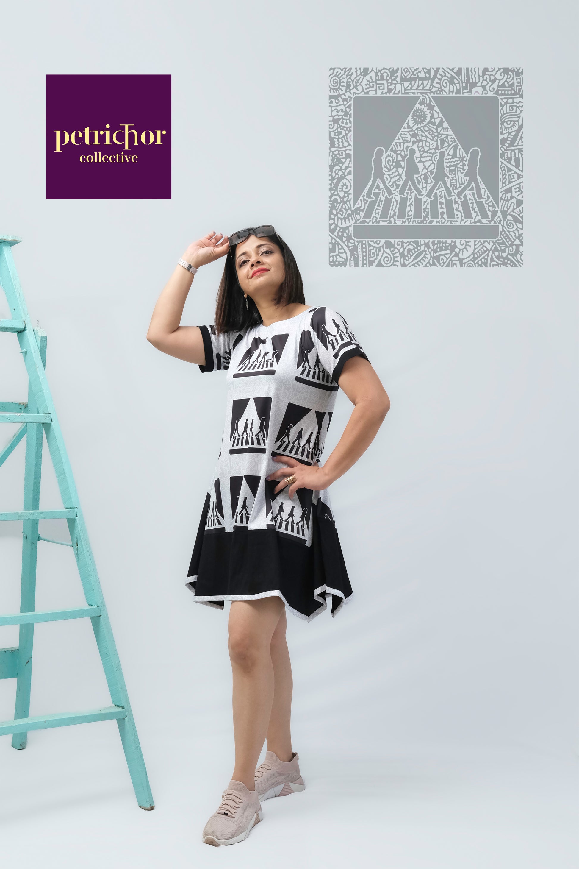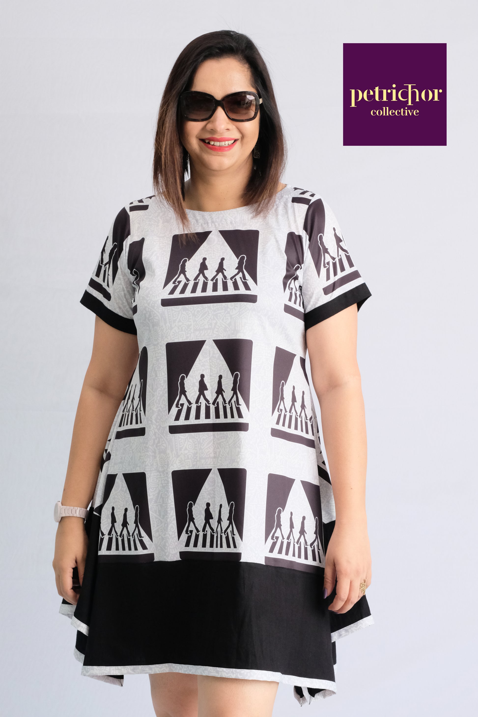 The iconic Beatles band's album cover, redrawn in our zenscrawl art form. Printed on lycra and combined with a black rayon to create a trendy, short, twirl dress.