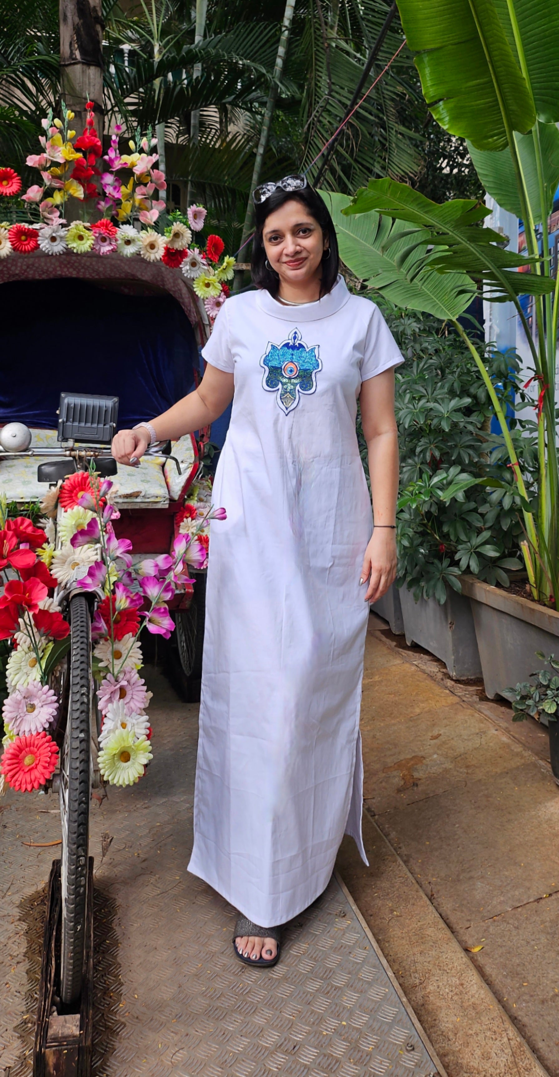 Elevate your style with this elegant white maxi dress, featuring a chic cowl neck and an embroidered motif of the Turkish evil eye, "nazar battu," for a touch of artistic flair.